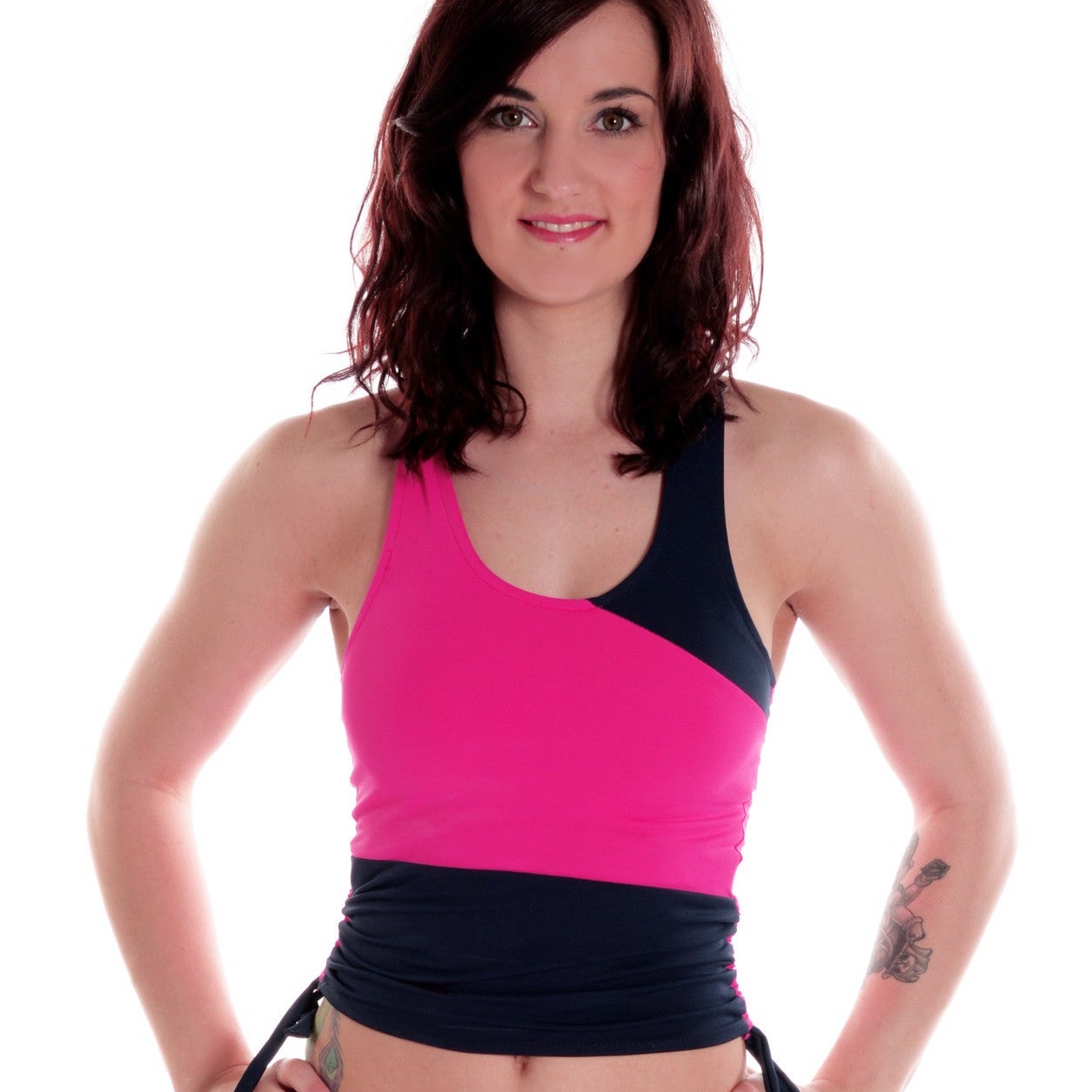 Vest with drawstring sides, ideal for when you don't want your entire mid section on display, but easy to hitch up to convert to a crop top when needed. Elasticated bust insert for added support. Elastic is cleverly placed on the inside so no pinching. Made in the UK using the highest quality Meryl/Lycra sports fabrics with anti bacterial and moisture wicking properties that leave you dry.