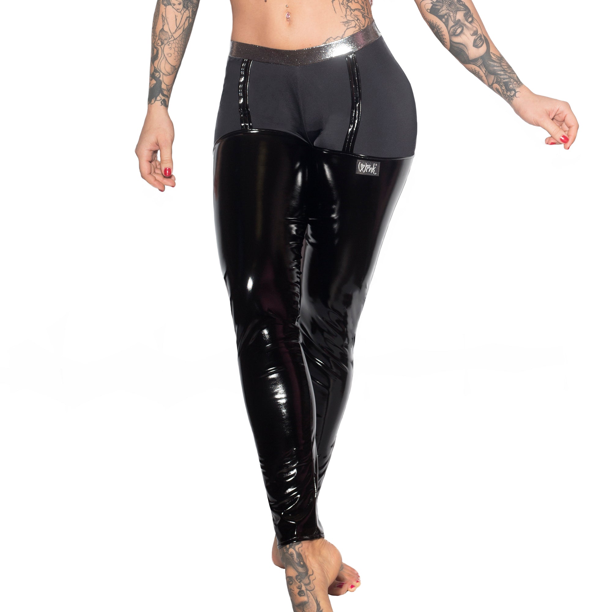 Valencia Grip Suspender Leggings with sticky Grip PVC legs that stick to the pole or aerial equipment. Our high quality PVC fabric is more sticky than our Wetlook Grip Leggings that work more like a second skin.