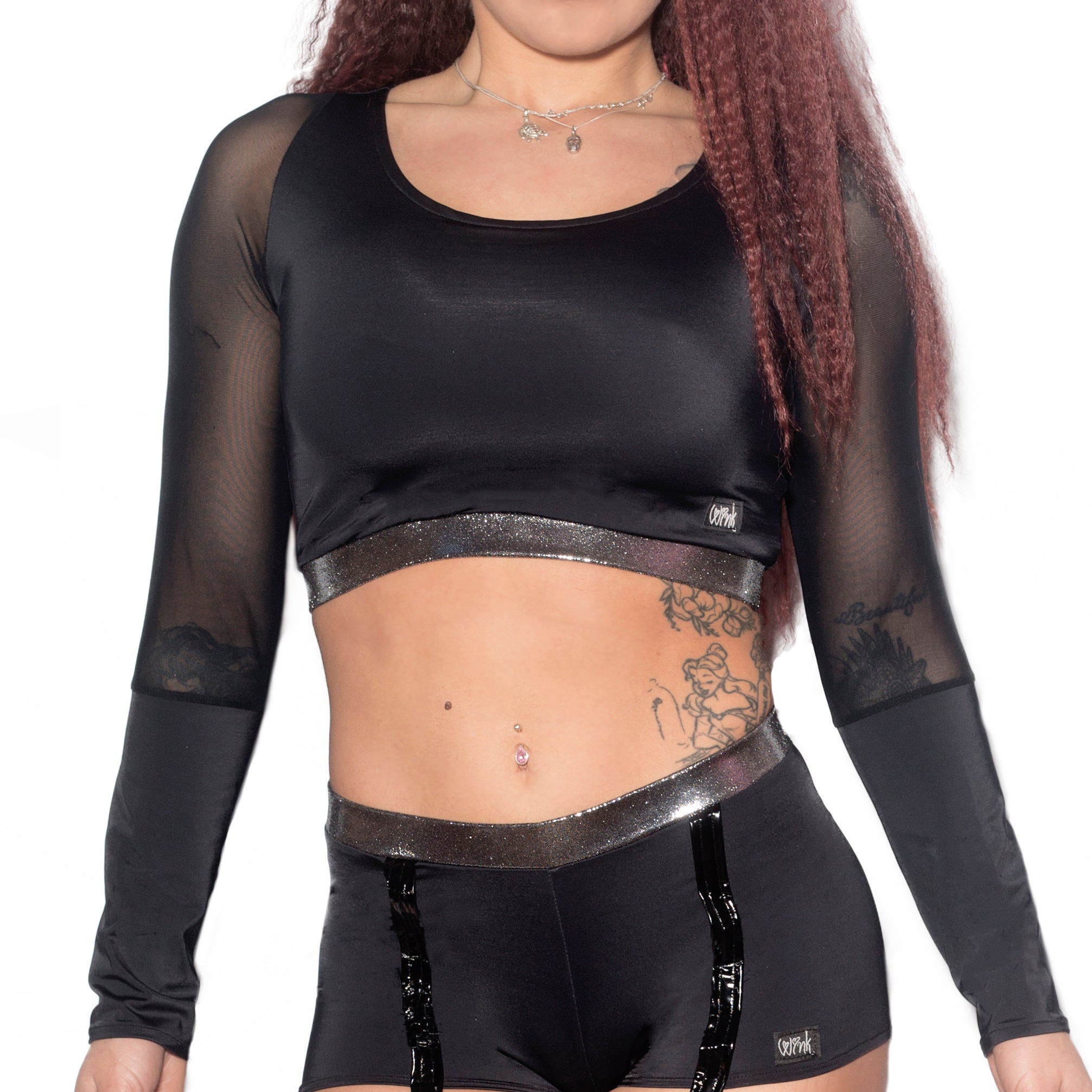 Double front layer for added support. Soft mesh sleeves, metallic shine elasticated hem.