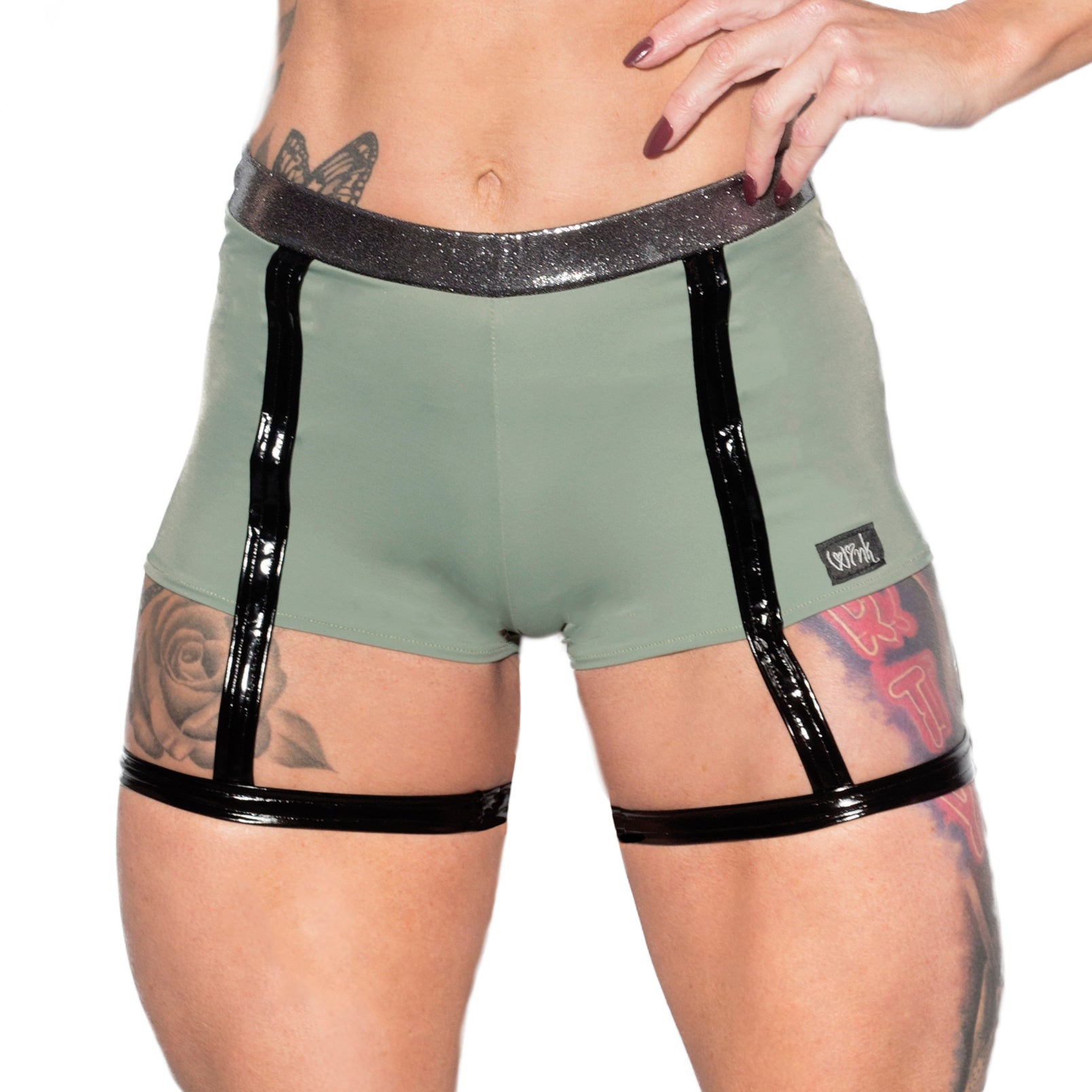 Wide gusset and 5cm leg length suitable for pole dance and yoga. PVC Grip suspender and thigh straps, metallic shine elasticated hem.